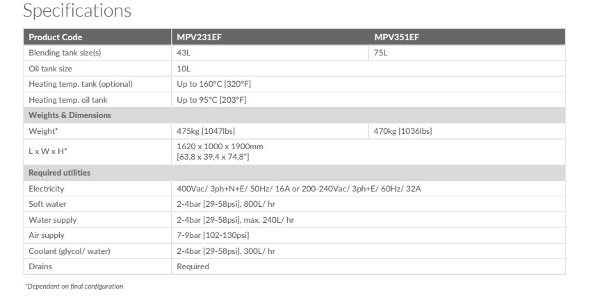 OMVE MPV231EF và MPV251EF là hệ thống trộn và nhũ hóa nhỏ gọn, hiệu suất cao với hai khoang: một khoang chính áp suất và một khoang dầu khí quyển. Mỗi khoang bao gồm các phễu cho bột và nguyên liệu lỏng.