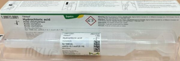 Hóa Chất Hydrochloric Acid 0.1N Merck 1099730001 của Merck là dung dịch axit clohydric (HCl) cô đặc ở nồng độ 0,1 mol/L (0,1 N). Sản phẩm này được thiết kế đặc biệt để làm dung dịch chuẩn Titrisol, nghĩa là dung dịch cô đặc dùng để pha loãng với 1000 ml nước cất để chuẩn bị dung dịch HCl 0,1 N chính xác cho mục đích chuẩn độ.