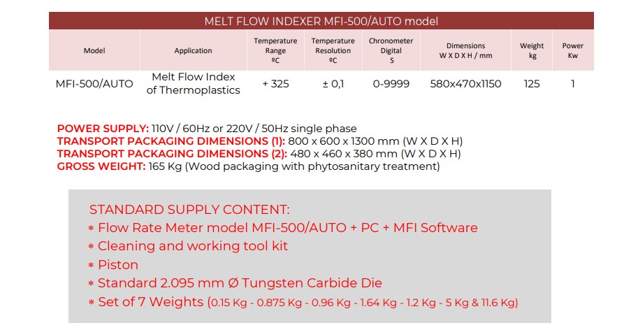 THÔNG SỐ KỸ THUẬT CỦA MÁY ĐO CHỈ SỐ NÓNG CHẢY NHỰA MFI-500/AUTO