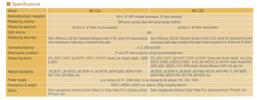 NR-12A của Nippon Denshoku là máy đo màu cầm tay gọn nhẹ, di động được thiết kế để quản lý màu sắc, với màn hình LCD màu lớn để so sánh màu tham chiếu và màu đo được, khẩu độ đo có thể lựa chọn (Φ3mm hoặc Φ10mm) và bộ nhớ trong để lưu dữ liệu. Máy hỗ trợ nhiều hệ màu và công thức hiệu chỉnh màu sắc, với các tùy chọn máy in và phần mềm quản lý màu độc quyền để phân tích nâng cao và vẽ đồ thị trên máy tính.