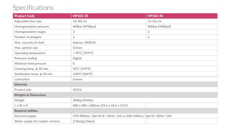 Máy đồng hóa hai cấp áp suất cao HP102 OMVE trực tuyến được thiết kế để vận hành liên tục với hệ thống OMVE HTST/UHT, nhằm mô phỏng chính xác quy trình sản xuất. Đồng nhất áp suất cao mang lại những đặc tính tốt hơn cho sản phẩm dạng lỏng, chẳng hạn như cải thiện độ ổn định, thời hạn sử dụng, hương vị, cảm giác trong miệng và có thể giảm số lượng phụ gia cần thiết.