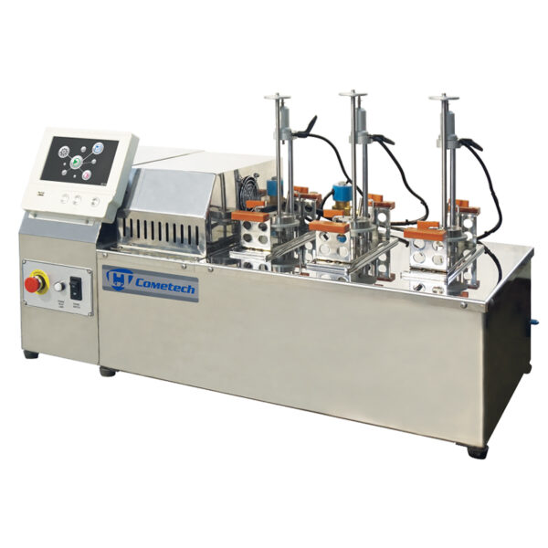 Máy thử độ biến dạng nhiệt HDT đa trạm (lên đến 3 trạm) Cometech QC-657B dành cho nhựa, có màn hình cảm ứng 7 inch, điều khiển nhiệt độ chính xác (từ nhiệt độ phòng đến 300°C với tốc độ 2°C/phút) và hiển thị kỹ thuật số độ biến dạng (0,001-3mm), tuân thủ tiêu chuẩn ASTM D648/ISO 75, cho phép dễ dàng chuyển đổi giữa các thử nghiệm HDT và Vicat bằng cách thay đổi giá đỡ và cung cấp dữ liệu đầu ra Excel để phân tích đặc tính vật liệu hiệu quả.
